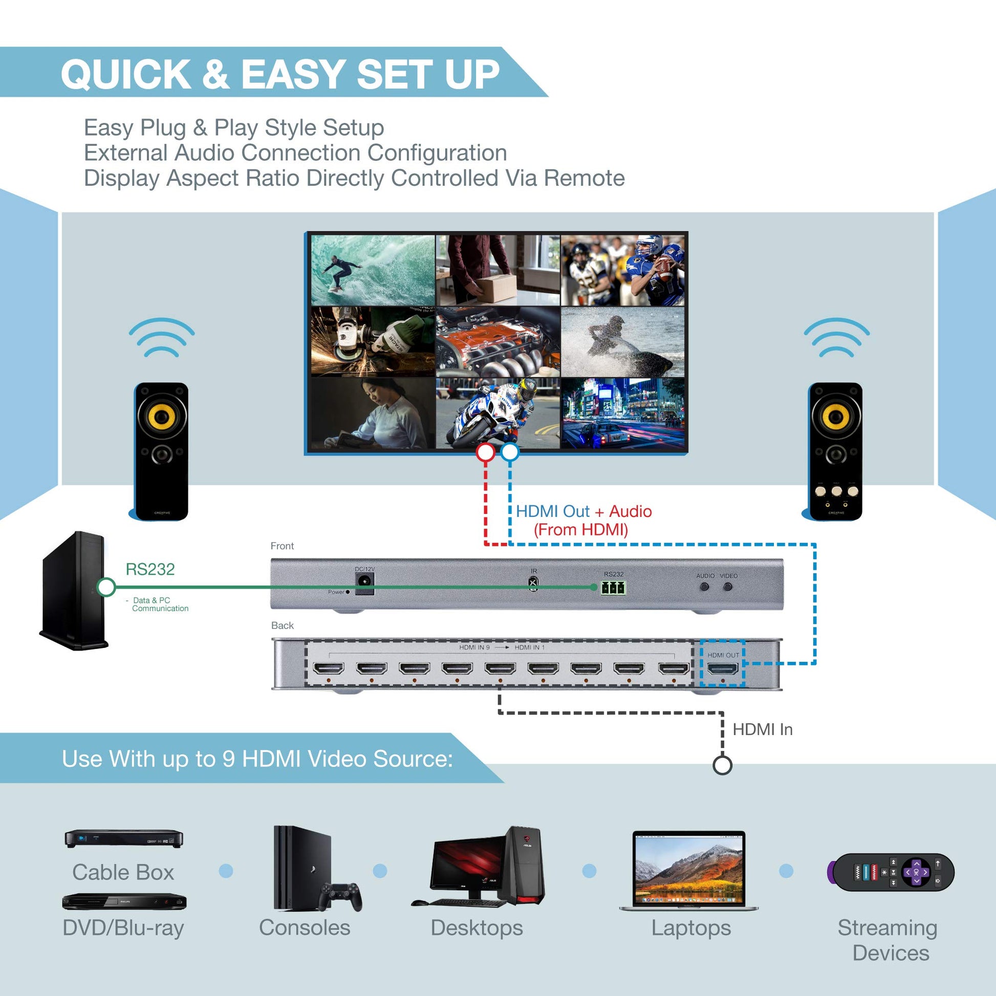 Expert Connect 9-Channel HDMI Multi-Viewer/Screen Divider/Switch | 1080p / 4K@30Hz | 11 Viewing Modes